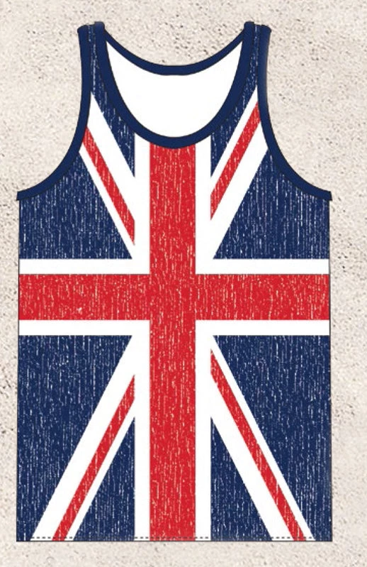 Men’s distressed British Union Jack flag tank top, sleeveless UK shirt with white back, British flag front and navy blue around arm openings and collar, sizes S, M, L, XL, XXL. CS-MUHDBF