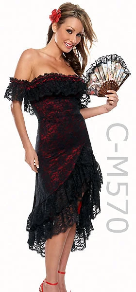 CLOSEOUT- This Spanish flamenco dancer costume DRESS is black lace over a red Lycra gown, sexy off-the-shoulder lace trimmed top, lace trimmed bias hem (fan not included). C-M570