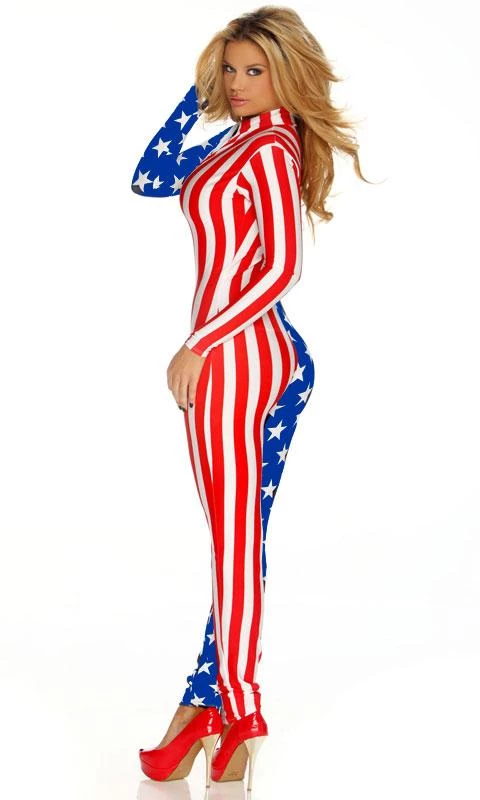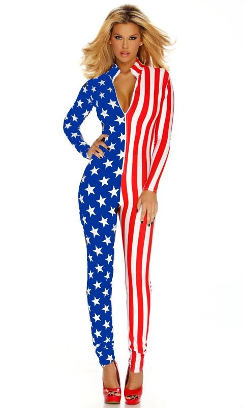 American flag long sleeve catsuit costume with front zipper closure, 4th of July bodysuit, patriotic USA jumpsuit. FP-113202
