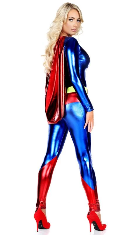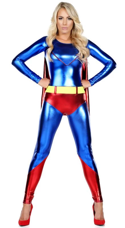 Superwoman 2-pc superhero costume includes two-toned metallic blue and red catsuit with attached short red metallic cape and vibrant neon yellow belt accessory, Polyester Spandex blend, Made in the USA. FP-555124