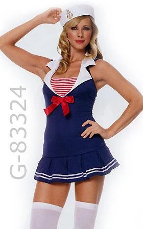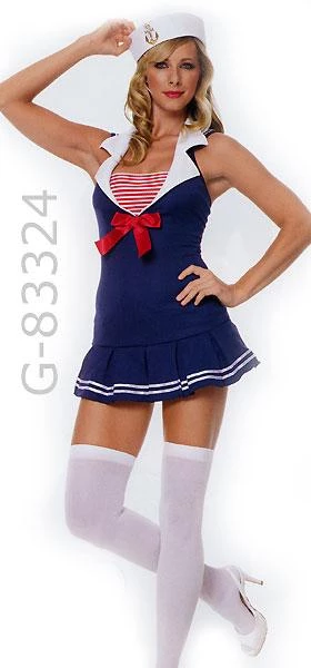 CLOSEOUT- This 2-piece American Sailor Cadet costume has a short blue mini DRESS with pleated skirting, red bow and back flap, Includes white sailor’s HAT with anchor patch. G-83324