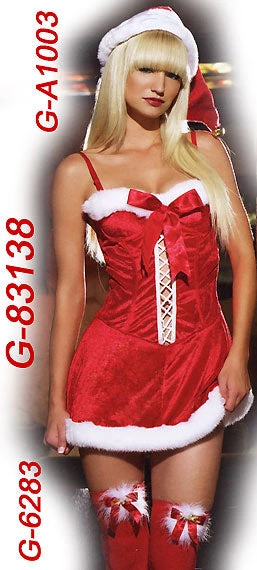 CLOSEOUT- Red Velvet Santa Lace-up Mini-Dress Costume. This sexy Christmas costume is our red velvet Santa mini-dress with underwire support, lace-up front trim and white fuzzy plush trim. Medium only. G-83138