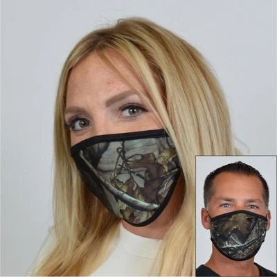 Forest camouflage face mask with ear loops, 2 layers lined with cotton fabric, washable, featuring a camo pattern. MC-M213