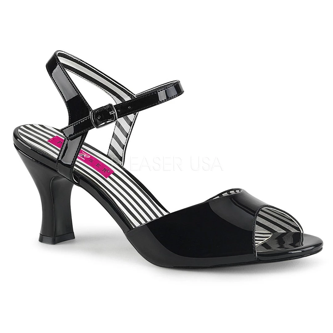 CLOSEOUT- Ankle strap peep toe sandal shoe with 3-inch (7.6cm) heel, available in red patent, cream patent, black patent of black faux leather. PS-JENNA-09