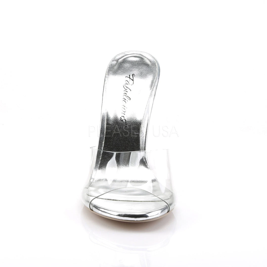 Clear slipper shoes with 4.5-inch (10.2cm) clear spike heel and 1/4-inch (0.6cm) clear platform. Size 5-12. PS-CLEARLY-401