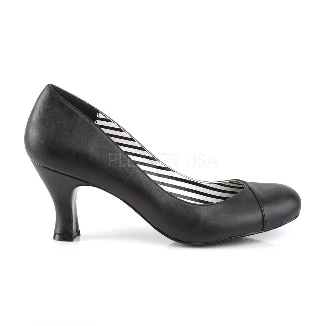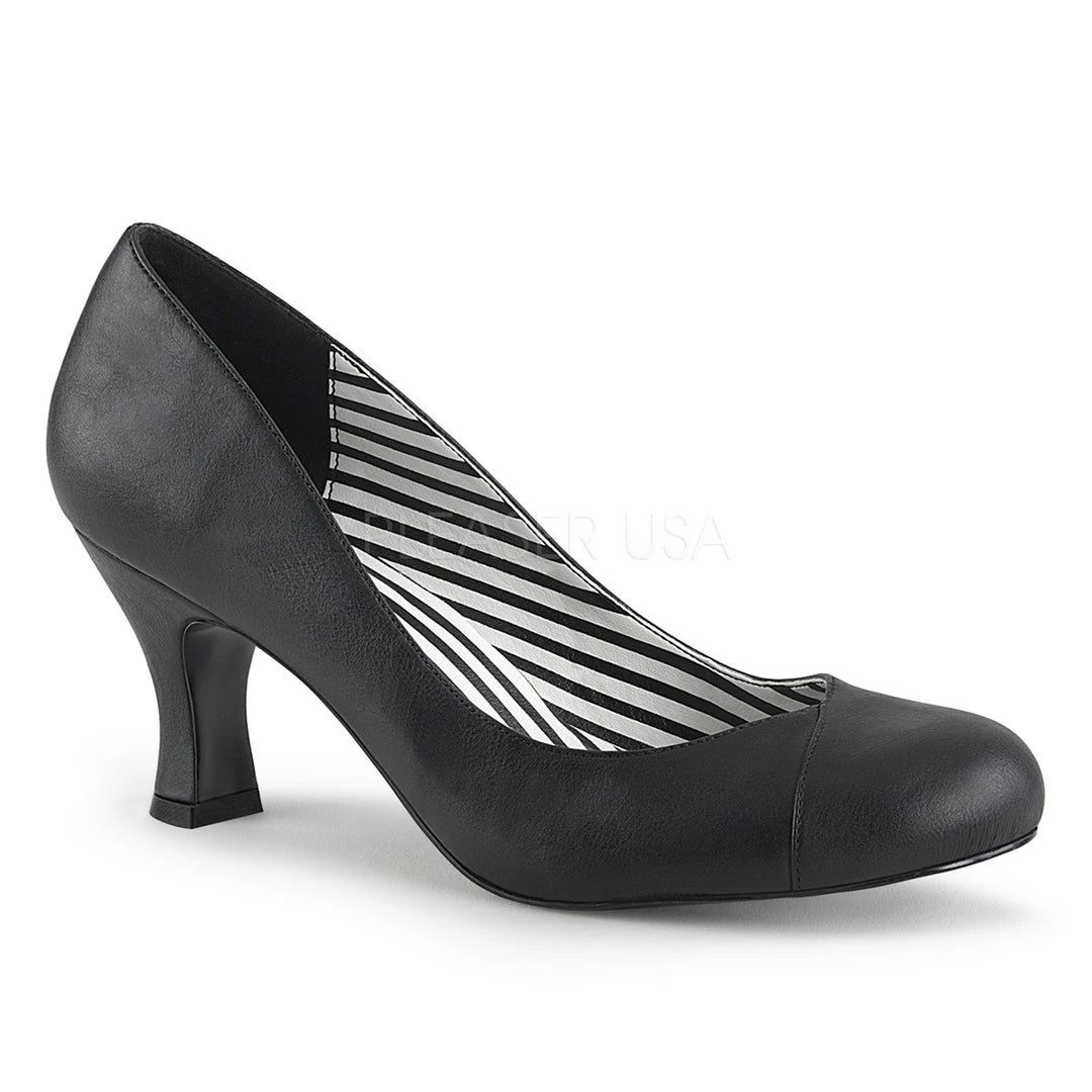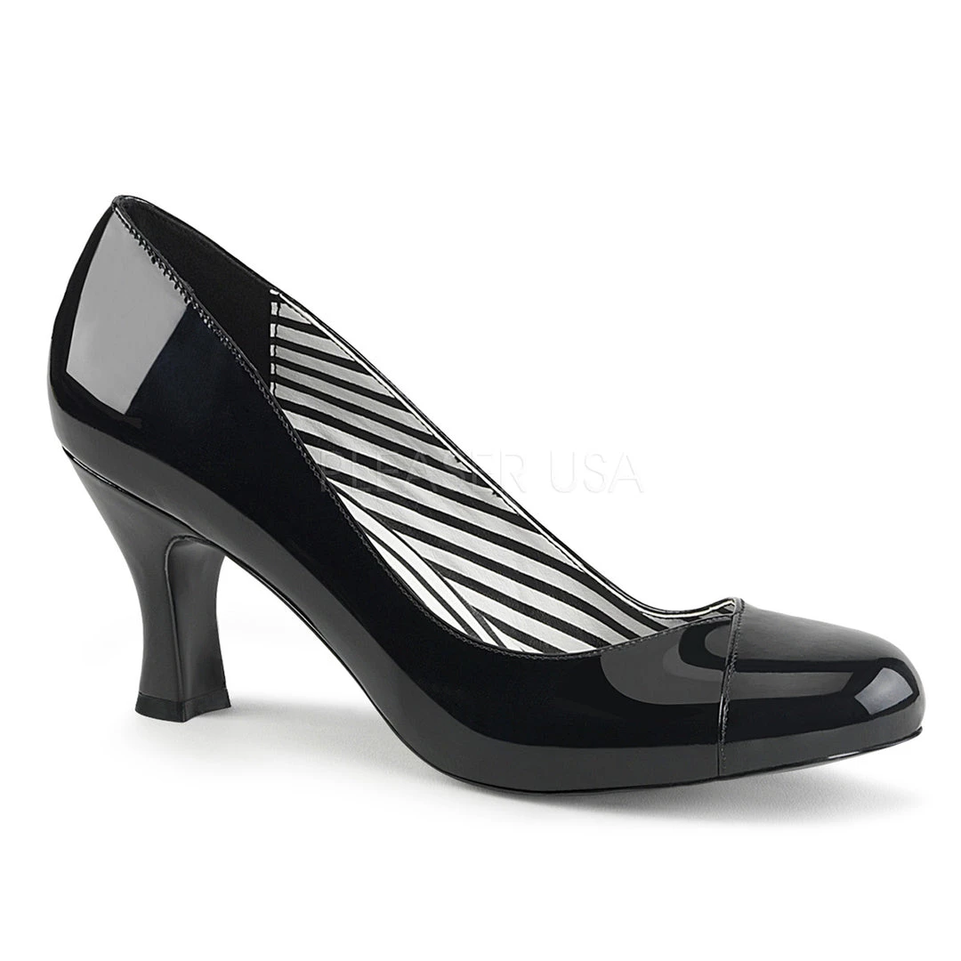CLOSEOUT- Closed toe pump shoes with 3-inch (7.6cm) heel, colors are black patent, black faux leather or cream faux leather. Sizes 9 to 16. PS-JENNA-01