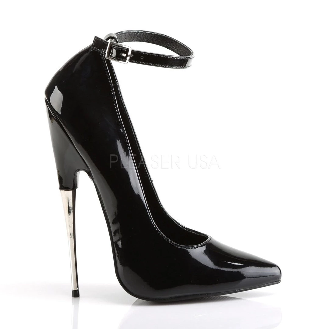 Fetish ankle strap pump shoes with steel 6-inch (15.2cm) spike heels, available in black or red patent. PS-SCREAM-12