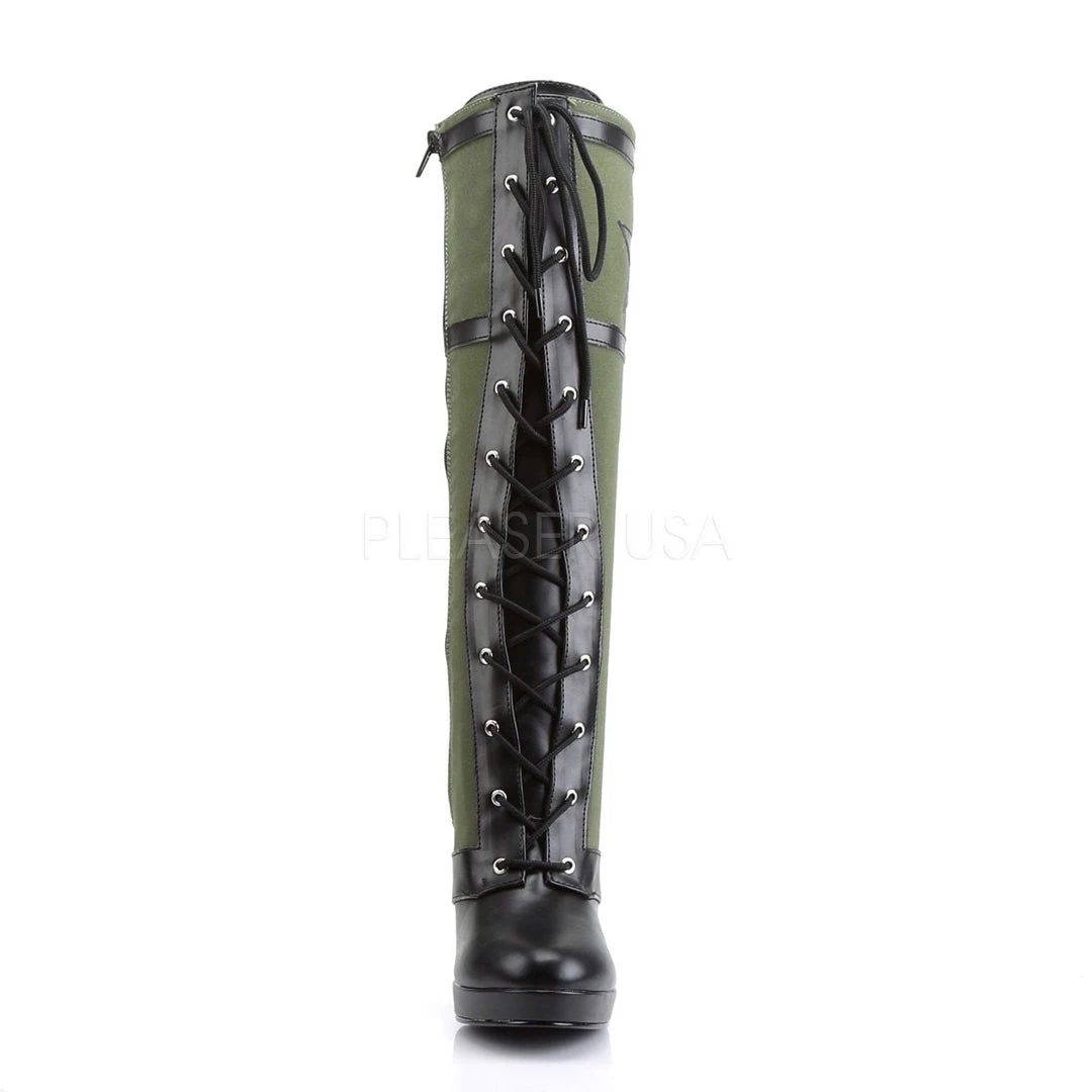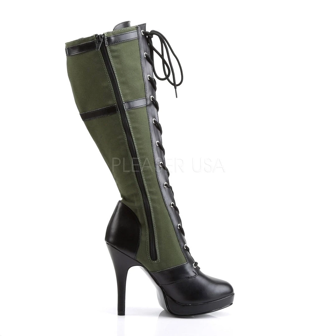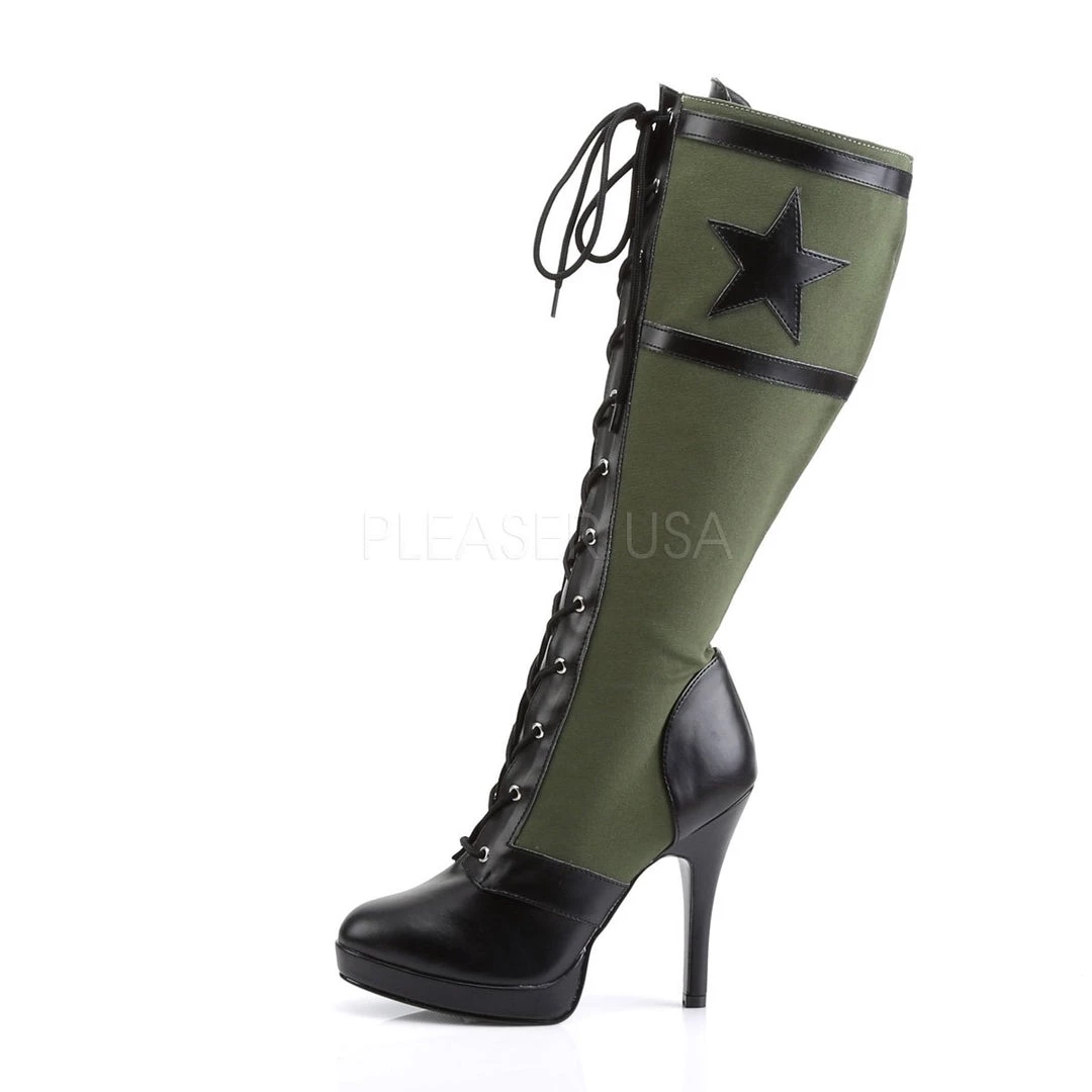 Front lace-up knee high Army green military boot with black star and stripes detail, 4.5-inch (11.4cm) heel and full-length inside zipper closure. PS-ARENA-2022