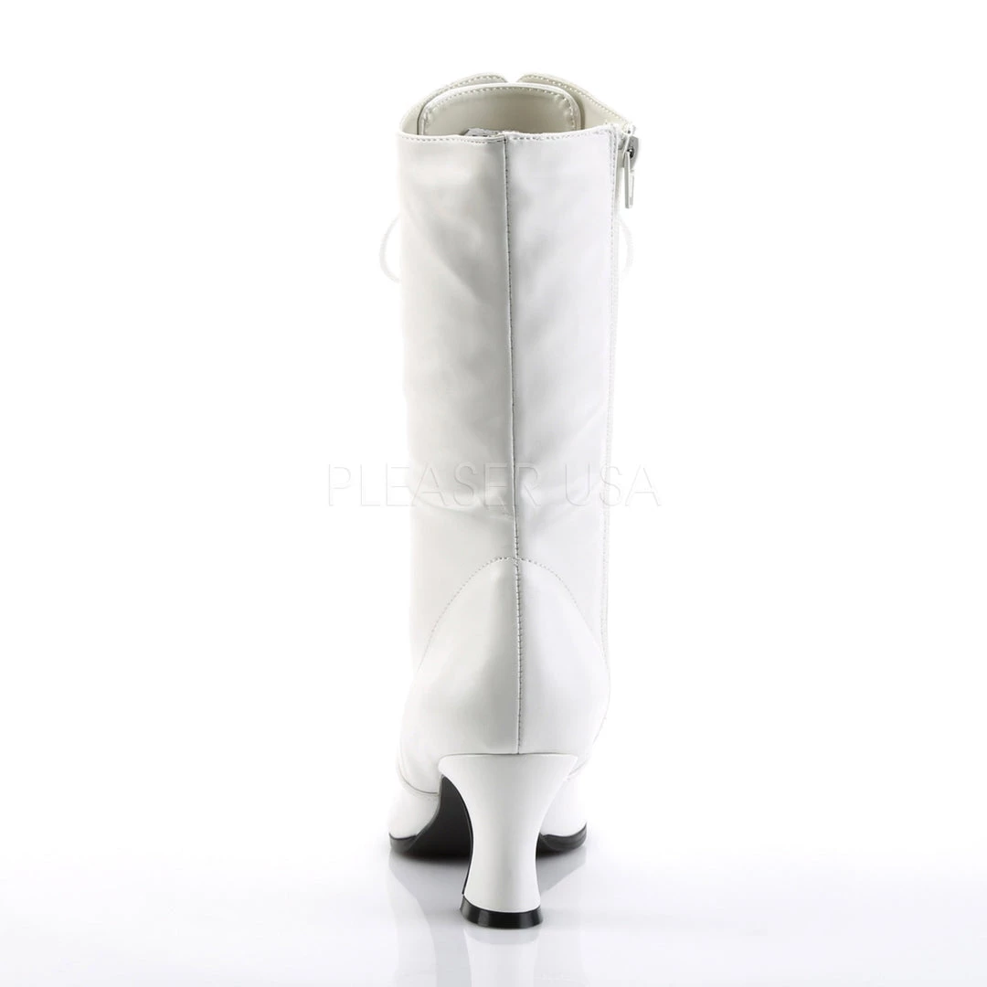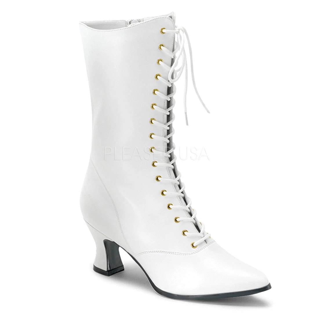 Faux leather lace-up ankle boots with 2.75-inch heels, colors are black, cream, brown or white. Sizes 6-12. PS-VICTORIAN-120