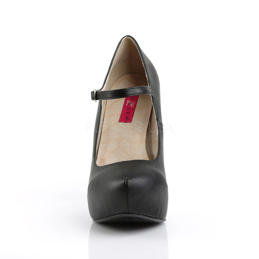 Mary Jane pump shoes with 5.25-inch (13.3cm) stiletto heel, 1.25-inch (3.2cm) concealed platform, colors are black patent or black faux leather (cream faux leather is CLOSEOUT color). Sizes 9 to 16. PS-CHLOE-02