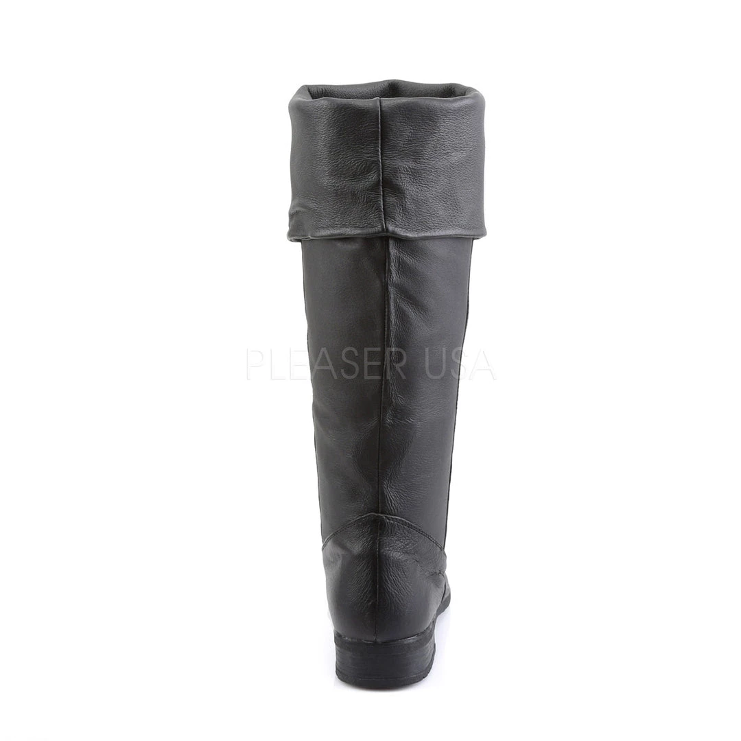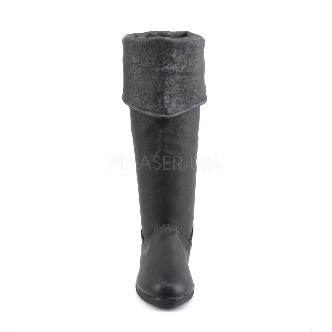 CLOSEOUT- Men’s leather knee high pirate boots with 11-inch bell cuff and 1.5-inch (3.8cm) flat heels, no zipper. Men’s sizes 8-14. PS-MAVERICK-8812