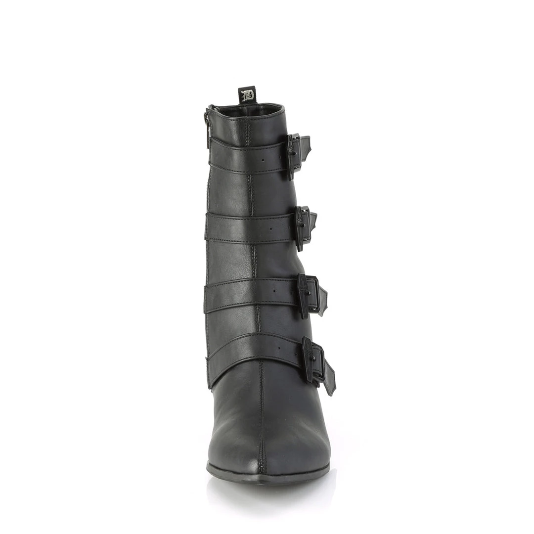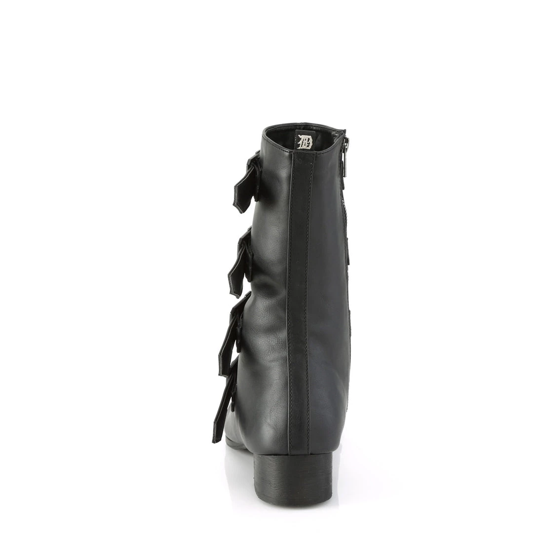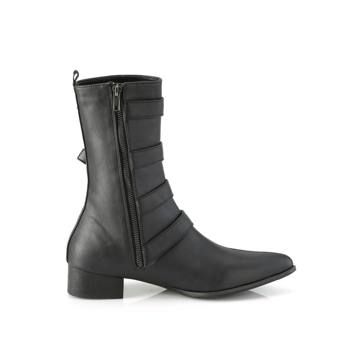 Pointed toe Winklepicker style mid-calf boot with 1.5-inch block heel, featuring 4 multi coffin buckle straps and inner side zipper closure, Black vegan leather, MEN’s Size 4-14, PS-WARLOCK-110-C