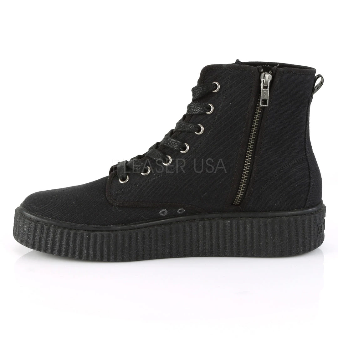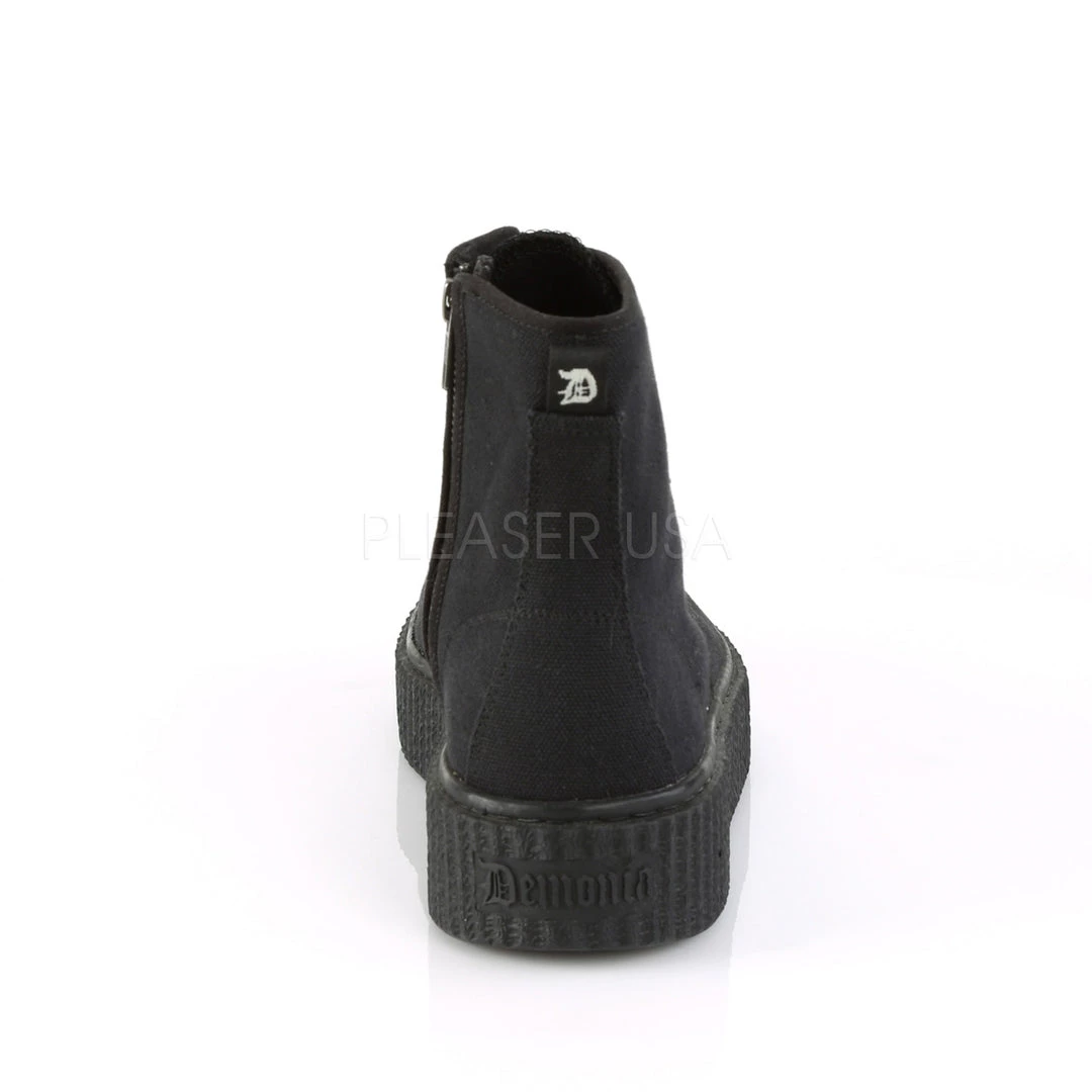 Unisex black high top round toe lace-up front creeper sneaker with 1.5-inch (38mm) platform rubber sole, full inside metal zipper closure. Men’s sizes 4 to 13 (for women’s approx. sizing, add 2 to the men’s size number). PS-SNEEKER-201