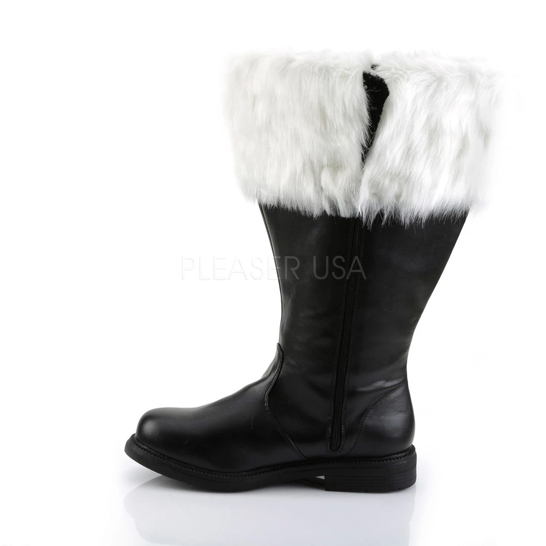 Men’s wide calf Christmas Santa boots with white faux fur cuff and 1-inch flat heels, full inner side zipper, black faux leather. Men’s sizes 8-14. PS-SANTA-106WC