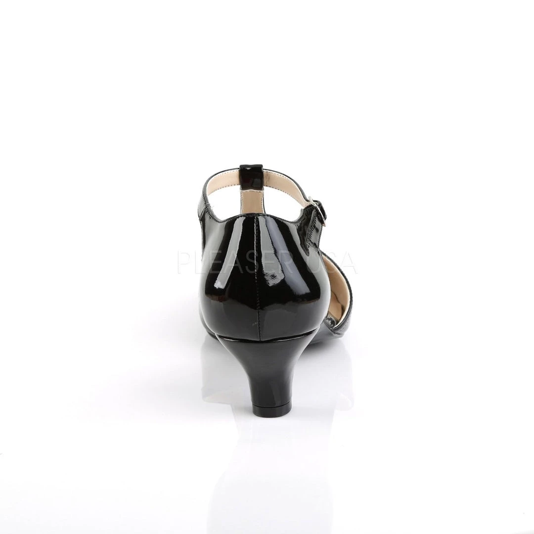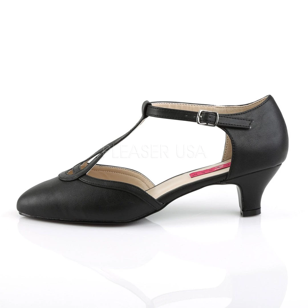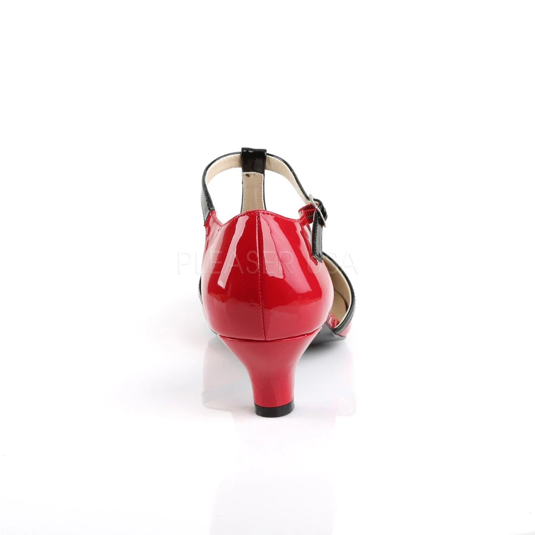 CLOSEOUT- T-Strap pump shoes with 2-inch (5.1cm) heels, available in red/black patent, black patent, black patent with white trim or black faux leather. PS-FAB-428