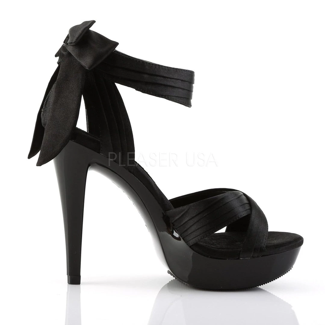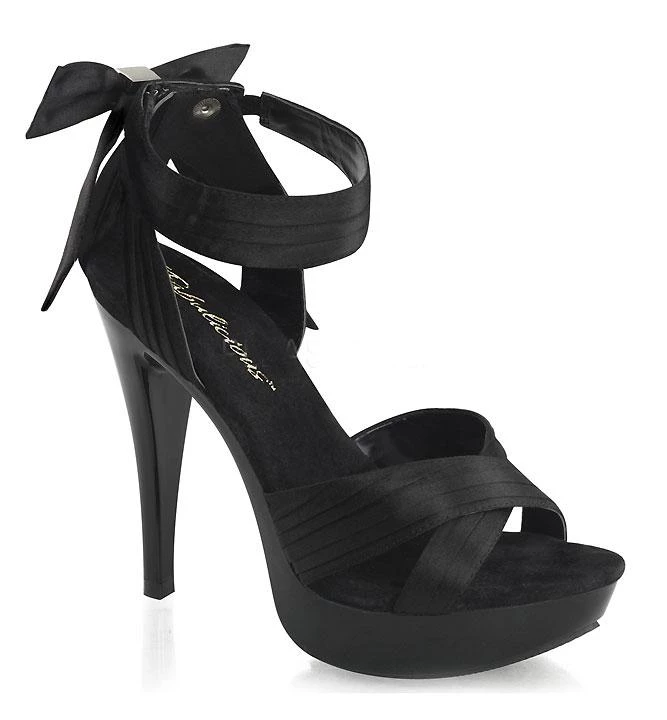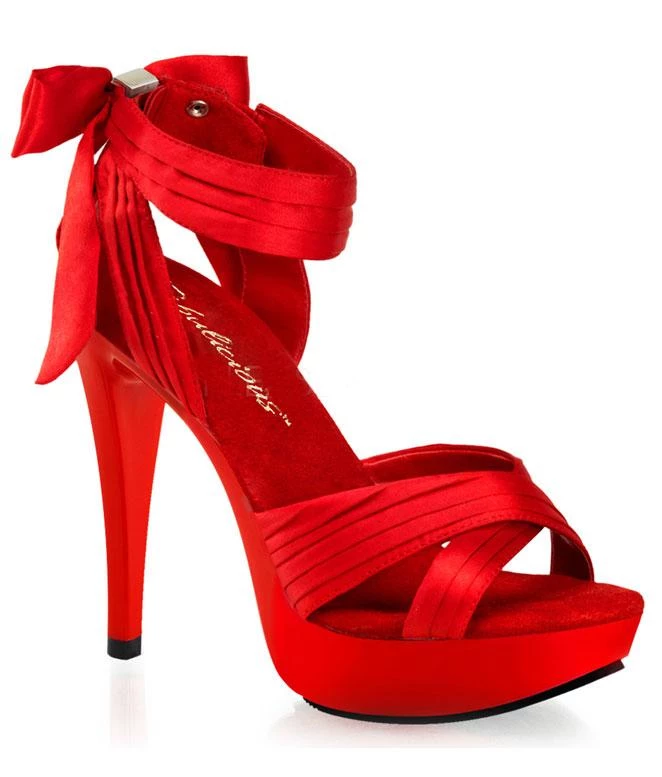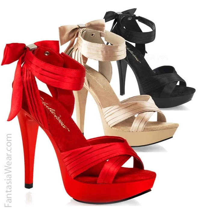 Criss-cross pleated satin strap sandal with 5 inch stiletto high heel and closed back, featuring one inch platform shoe and ankle strap with bow in back, colors are Black or Red (Champagne is a CLOSEOUT color). PS-COCKTAIL-568
