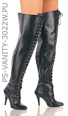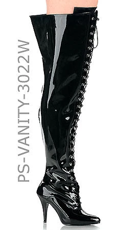 DISCONTINUED- Plus size thigh high front lace-up boots with 4-inch spike heels and a wide boot shaft, size 9 in black. PS-VANITY-3022WS