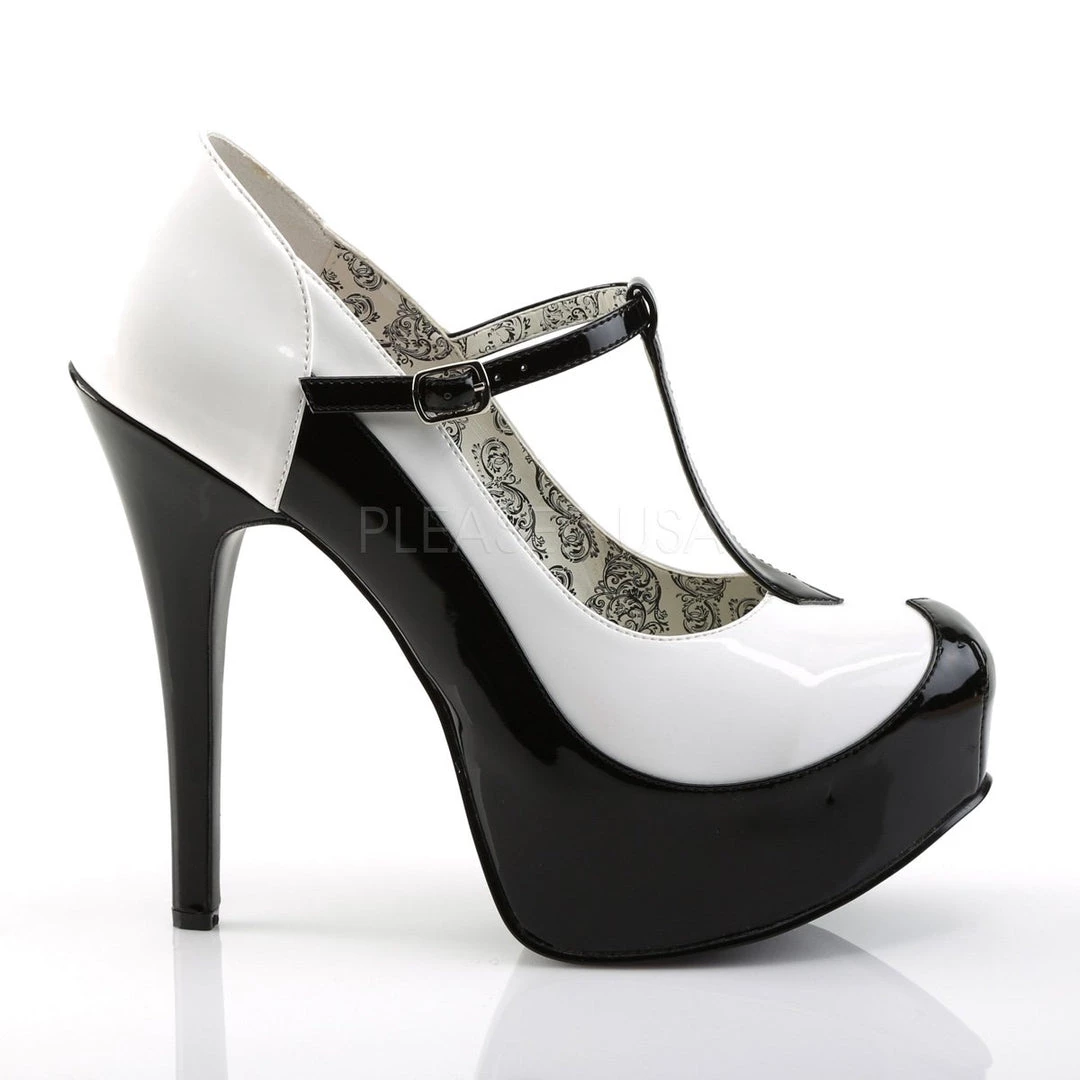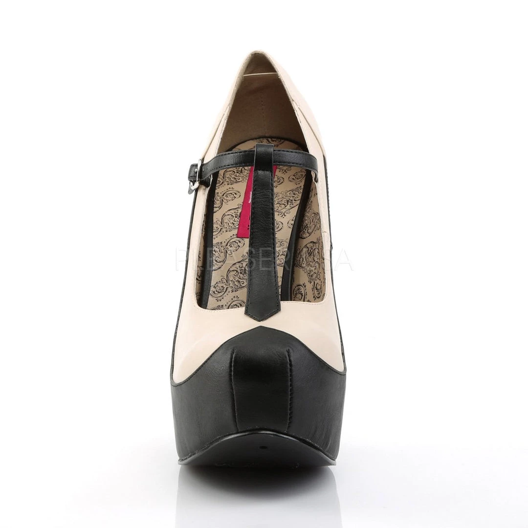DISCONTINUED- Two-tone T-strap pump shoes with 5.75-inch (14.6cm) spike heel, 1.75-inch (4.5cm) platform, available in black-cream faux leather (Black-White patent is discontinued and out of stock) PS-TEEZE-45W