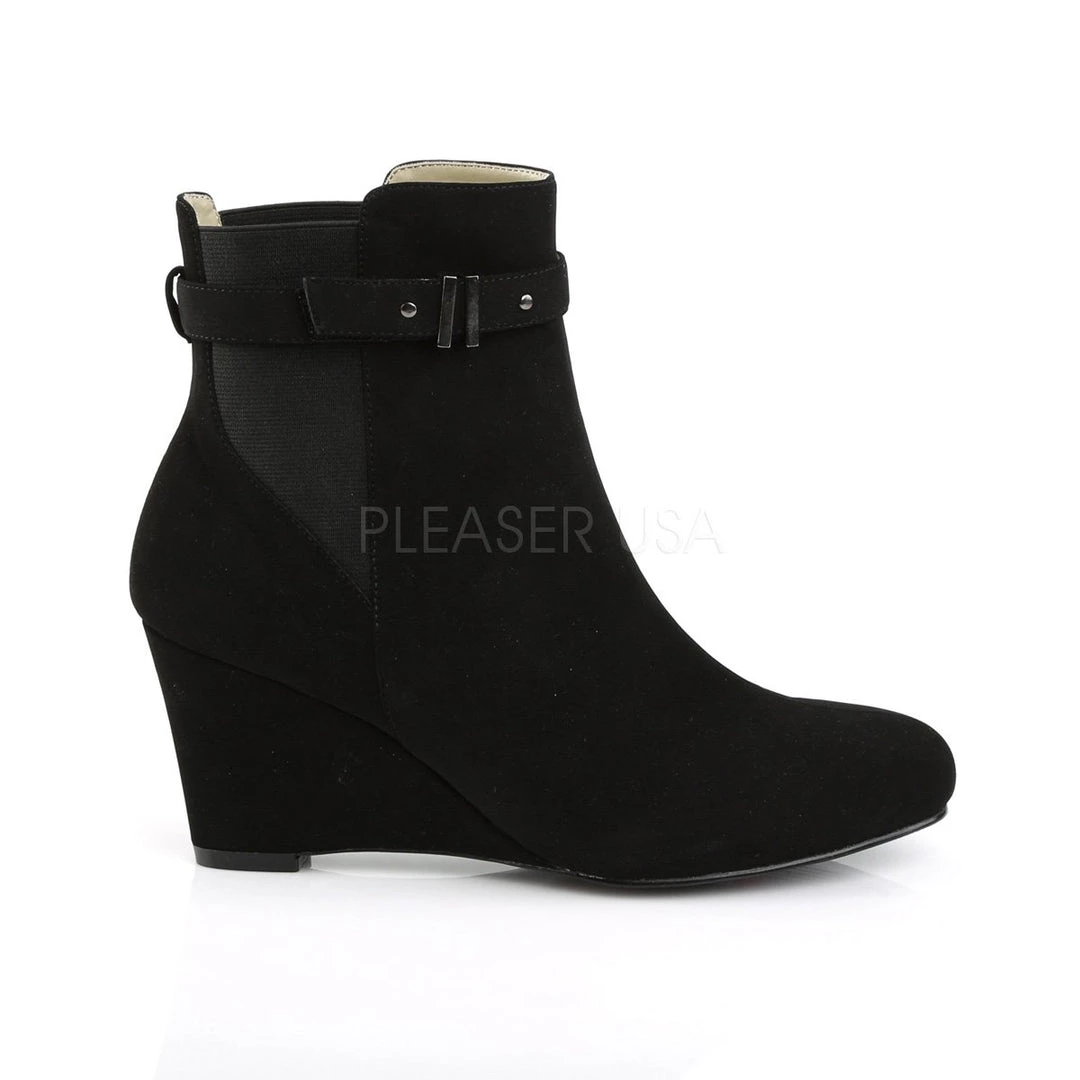 Ankle boot with 3-inch (7.6cm) wedge heel, no zipper, available in black faux leather or black suede nubuck (brown faux leather is a CLOSEOUT color). Sizes 9 to 16. PS-KIMBERLY-102