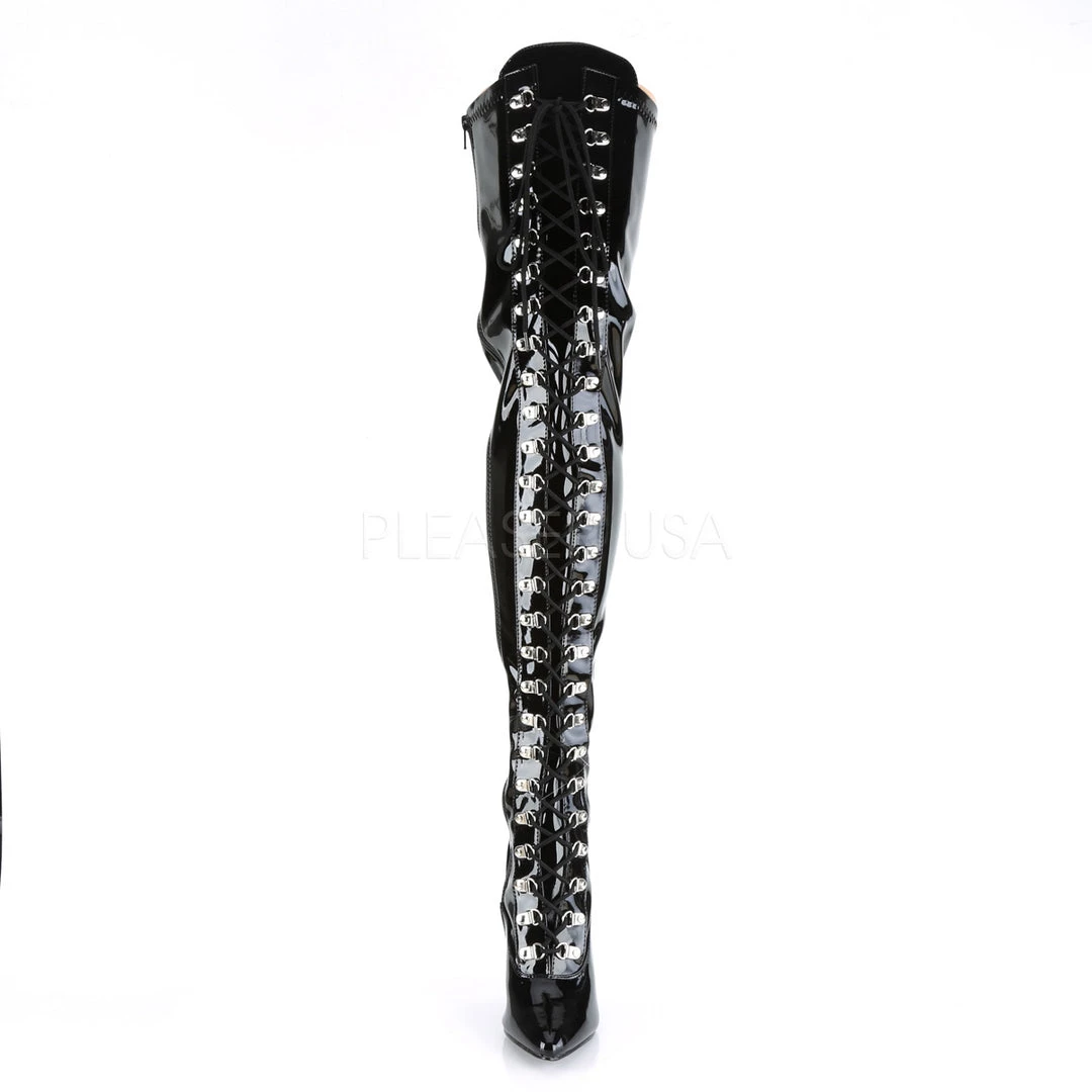 D-ring lace-up stretch thigh high boots with 5-inch (12.7cm) spike heels, full inner side zipper, in black patent or black faux leather. Sizes 6 to 16. PS-SEDUCE-3024