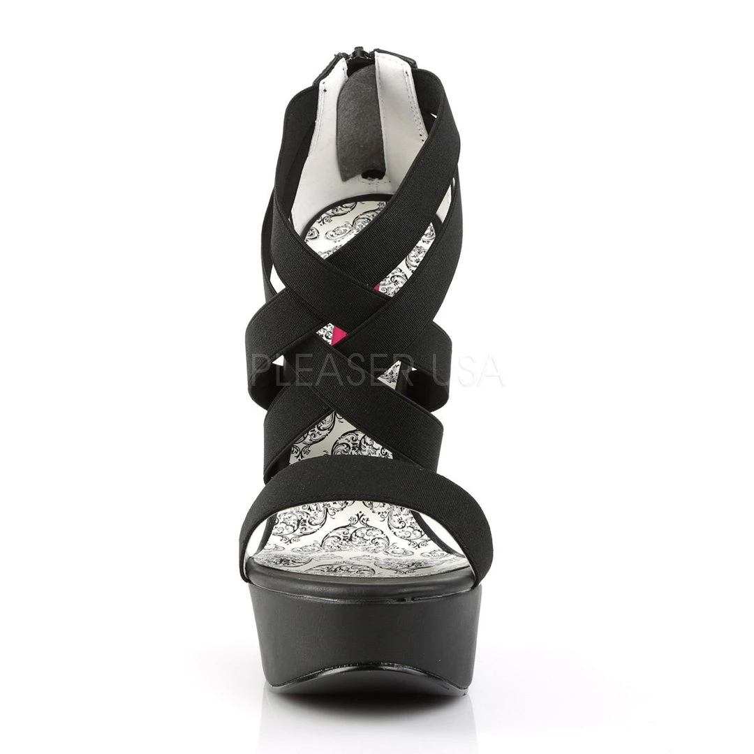 Black crisscross elasticated band, close-back peep toe sandal shoes with 5.75-inch (14.6cm) spike heel, 1.75-inch (4.5cm) platform, back zipper. PS-TEEZE-47W