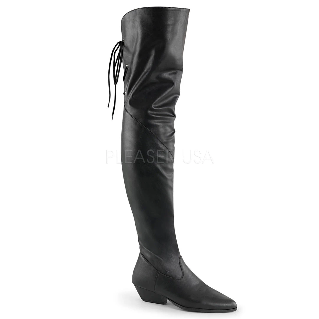CLOSEOUT- Thigh high boots with 1.5-inch heels, black leather or black faux leather. PS-RODEO-8822Â