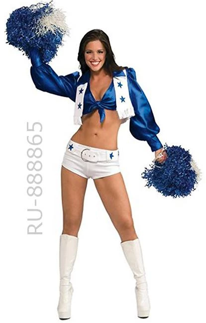 CLOSEOUT- Authentic licensed Dallas Cowboys Cheerleader 2-piece uniform includes tie front blue top with long puffy sleeves with attached white fringed vest plus white shorts with belt. RU-888865Â