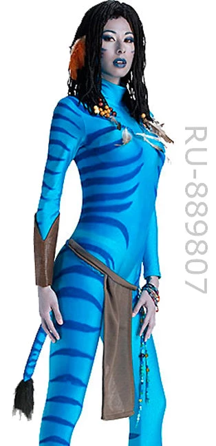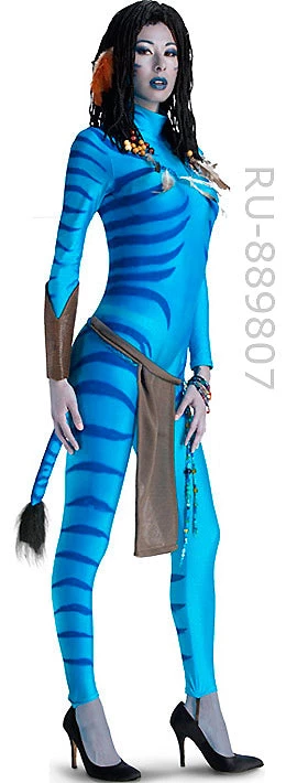 Our blue Adult Neytiri Costume is licensed from the new movie “Avatar”. This costume features great detailing with the two-toned blue lines and can make anyone look like a Na’vi. Included with our Adult Neytiri Costume is the jumpsuit with attached tail, apron, and bracer. (the wig, shoes, and jewelry are sold separately). Get our official Avatar blue deluxe makeup kit (ears included) to paint your own face stripes on. It’s pretty easy to paint your face, you can even use your fingers for this! Just smooth on the light blue glitter makeup all over your face. Then ‘finger paint’ some darker blue stripes on your face. Voila! You’re an instant Pandoran. Our costumes are great for Halloween and any other party that requires dressing up.