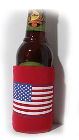 American flag insulated can jacket helps keep beverage cans and bottles frosty cold on hot days, easily identifying one’s beer or soft drink beverage from another person’s. Red neoprene can sleeve features United States of America flag. Using a can cozy or jacket can reduce the rate a drink warms in the sun by up to 50%.