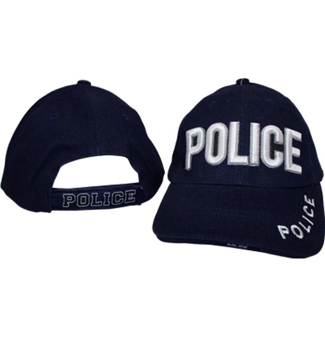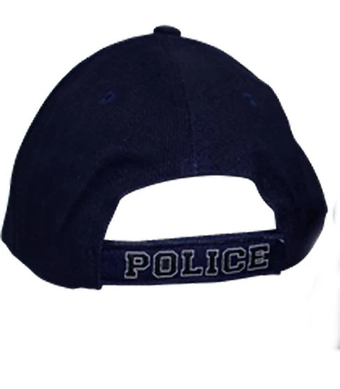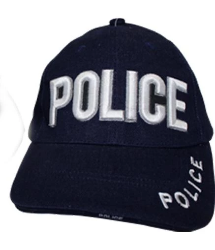 Navy blue cap with white embroidered POLICE on the front, the back and the bill of the cap.