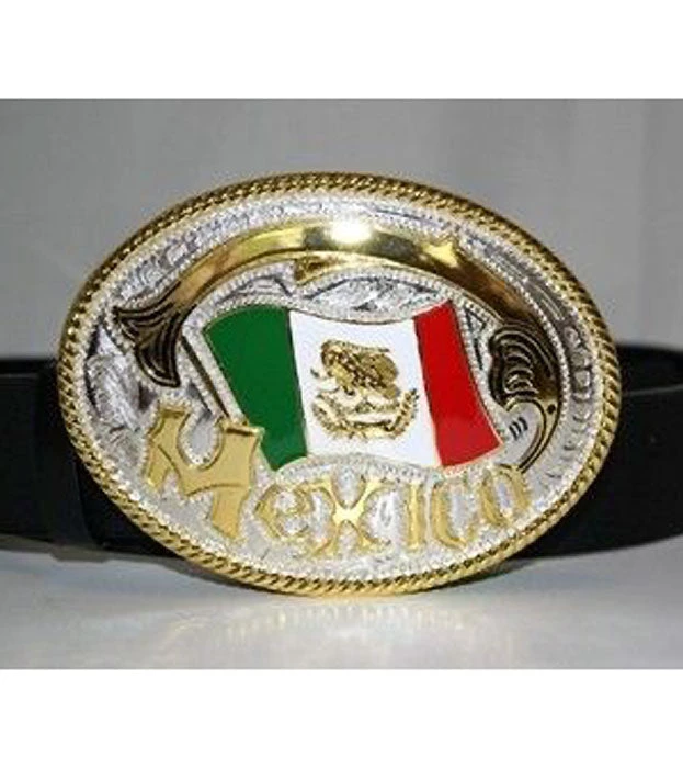 Flag of Mexico oval belt buckle. This Mexican buckle is 4 inches by 3 inches. RF-81915