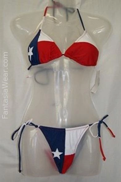 Are you brimming with Texas pride? Show it off by wearing the Texas Flag string bikini whenever you’re headed to the pool or to the shore. Featuring the image of the Lone Star state’s flag, this sexy two piece set is made from 100 percent Lycra and has a side tie American bottom back coverage. Hey, y’all order yours today, ya’ hear.