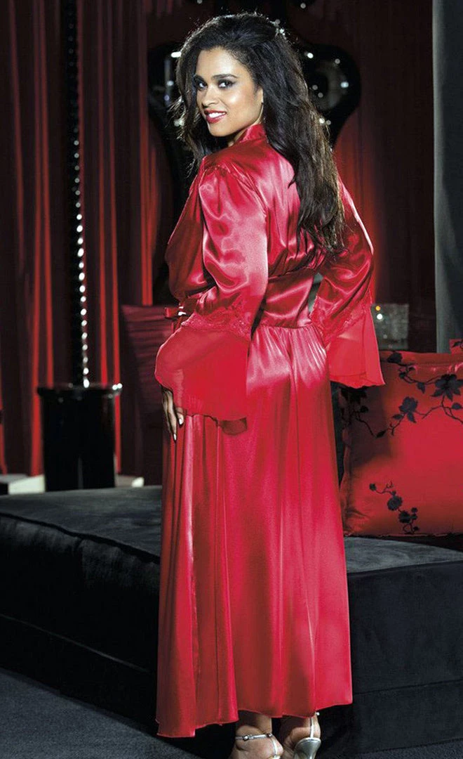 Elegant and sexy, this plus size silky charmeuse, lace and chiffon long robe is Hollywood glamour at it’s finest. The gorgeous lace trimmed bodice is highlighted by the build up shoulder seam while the fitted waist and self belt closure speak to elegant flair. Full sweep to the hem of the robe offers an even more luxuriousness. Comes with side pockets and inner tie. Colors: Black, Red, White. Sizes: 1/2x, 3/4x. SH-X20559