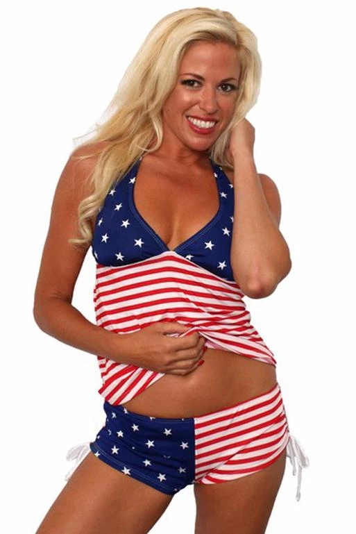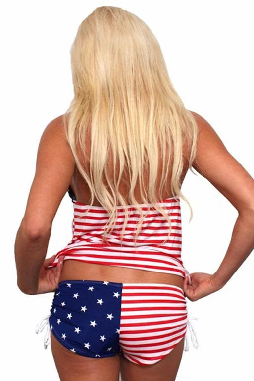 CLOSEOUT- Wear it proudly and be sexy with this 2-piece USA flag swimsuit. American flag tankini with matching string shorts that have adjustable side ties. Comfortable, breathable, lightweight and dries quickly, 80% nylon, 20% spandex, women’s size 4 to 14, To preserve the integrity of the garment: Machine wash cold. Recommended Hang Dry only.