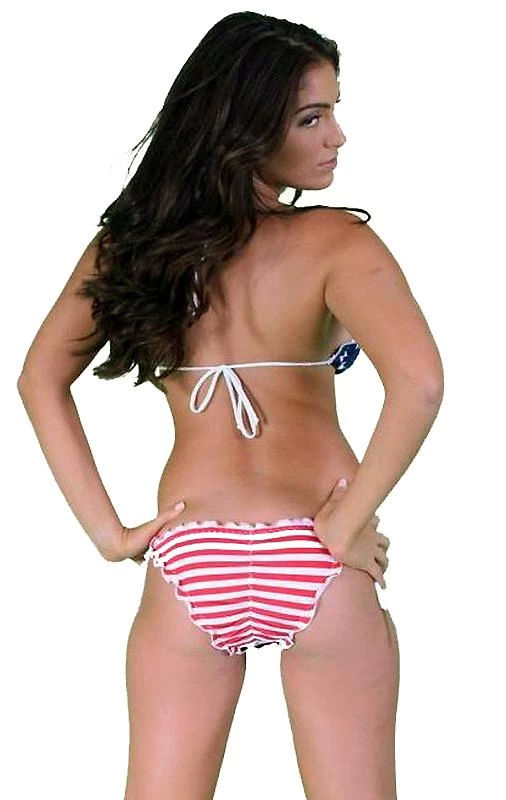 CLOSEOUT- American flag RUFFLE bikini 2-pc. set, ruffle trim stars and stripes scrunch back bikini bottom and matching triangle top, front fully lined with soft white fabric. Sizes: L or XL. Excellent Swimwear. Comfortable, breathable, lightweight and dries quickly, 80% nylon 20% spandex. To preserve the integrity of the garment: Machine wash cold, gentle cycle. Recommended Hang Dry only. ST-ST233