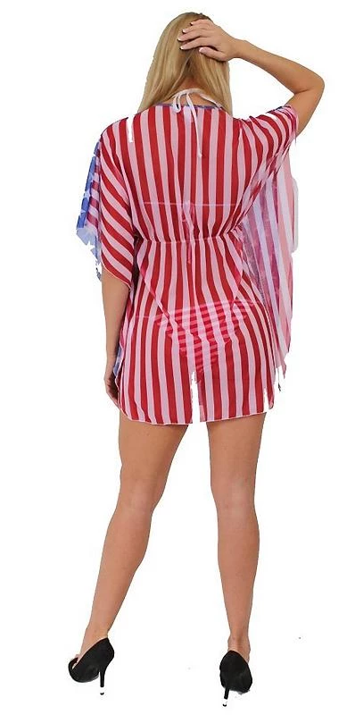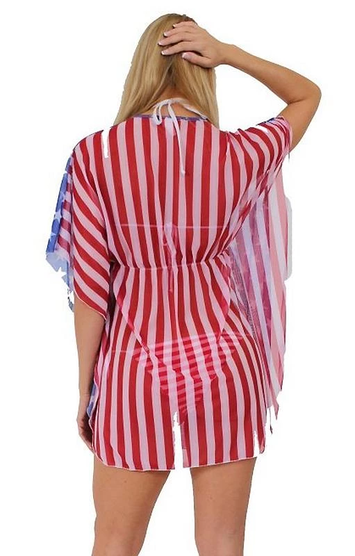CLOSEOUT- American flag sheer short sleeve beach dress, USA stars on front and red and white stripes on back, 100% polyester swimwear cover-up, ONE SIZE, Comfortable, breathable, lightweight and dries quickly. To preserve the integrity of the garment: Machine wash cold. Recommended hang dry only. ST-ST260