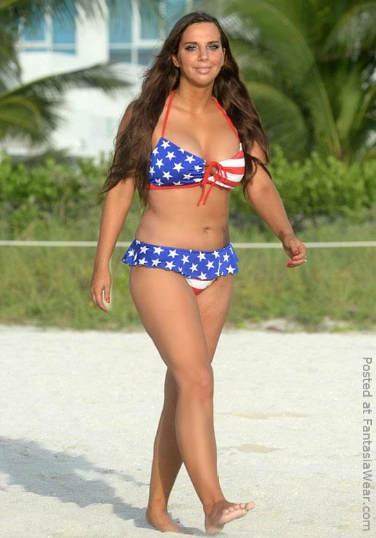 Big Star Full Scoop Ruffle Bottom Scoop front, Wide sides, Sits at waist, Full rear coverage, Ruffle Accent, Stars/Stripes Nylon/Lycra fabric, Available in plus size American flag bikini bottom, Sizes: S (2-4), M (6-8), L (8-10), LL (12-14), 1X (14-16), 2X (18)