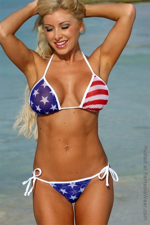 This Sheer Big Star American Flag Tonga Bikini is skimpy, sheer and patriotic! Celebrate the USA in sexy style. Sliding triangle top ties in back and around your neck for a perfect fit. Size tie Tonga thong back bottom is sexy and will show off your best asset. Bring out your American side in this red, white and blue bikini. Matching Sheer Big Star Wrap Skirt U-Z510 sold separately.